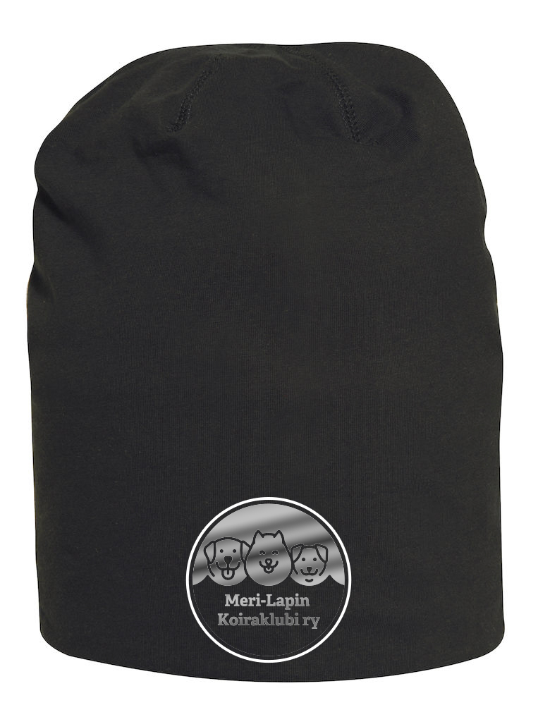 Mustassa pipossa harmaa heijastava painatus.