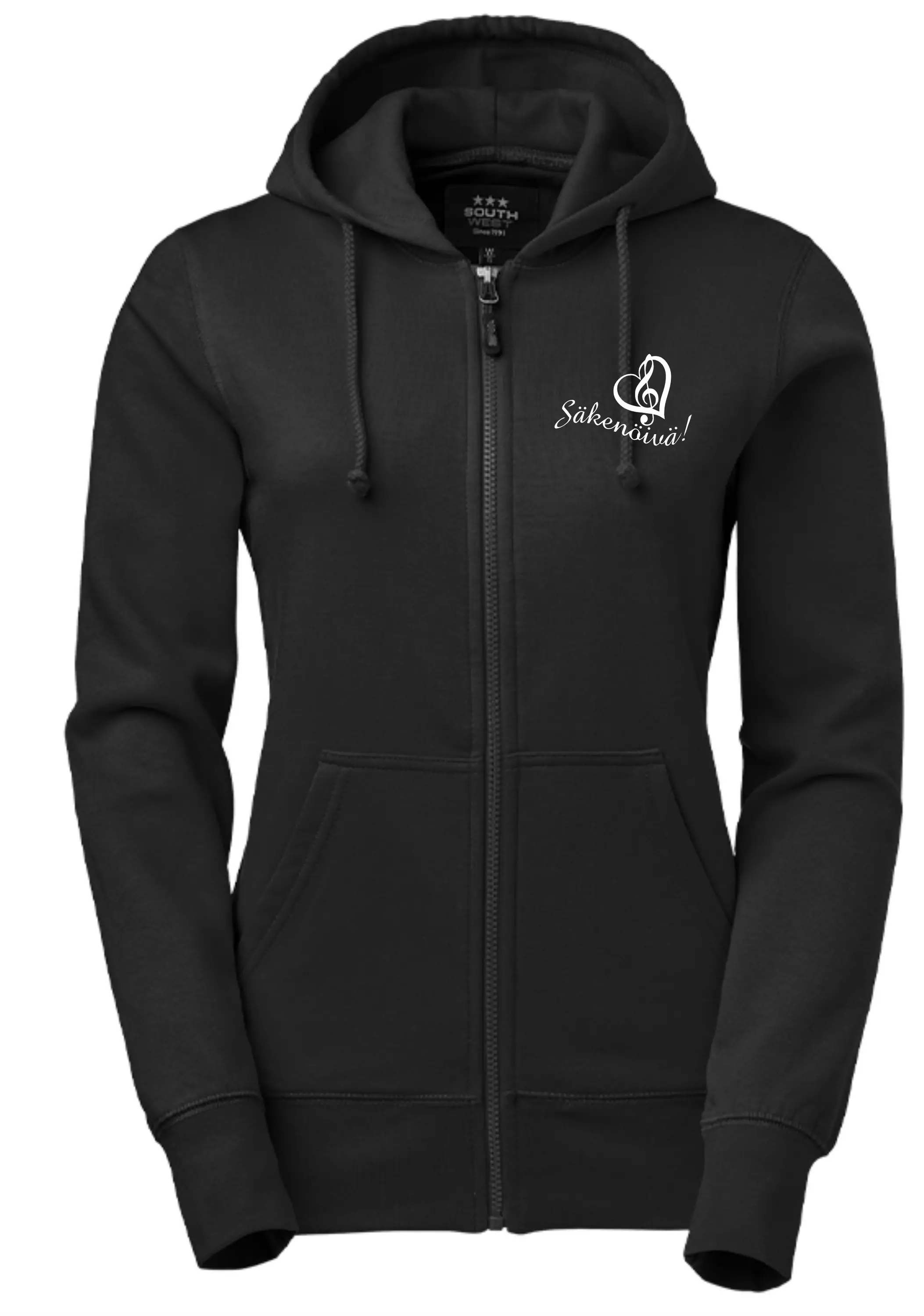 Collegetakki, jossa on vartalonmyötäinen istuvuus, täysvetoketju, kaksinkertainen huppu ja kaksi etutaskua.